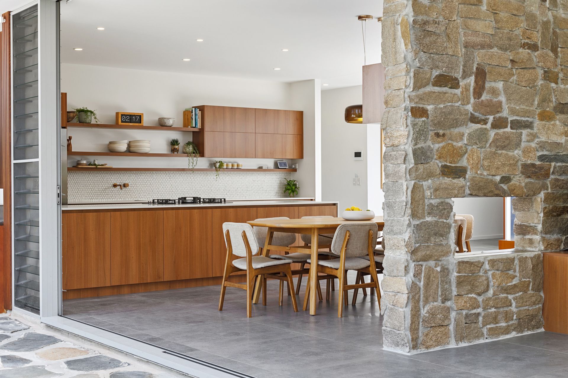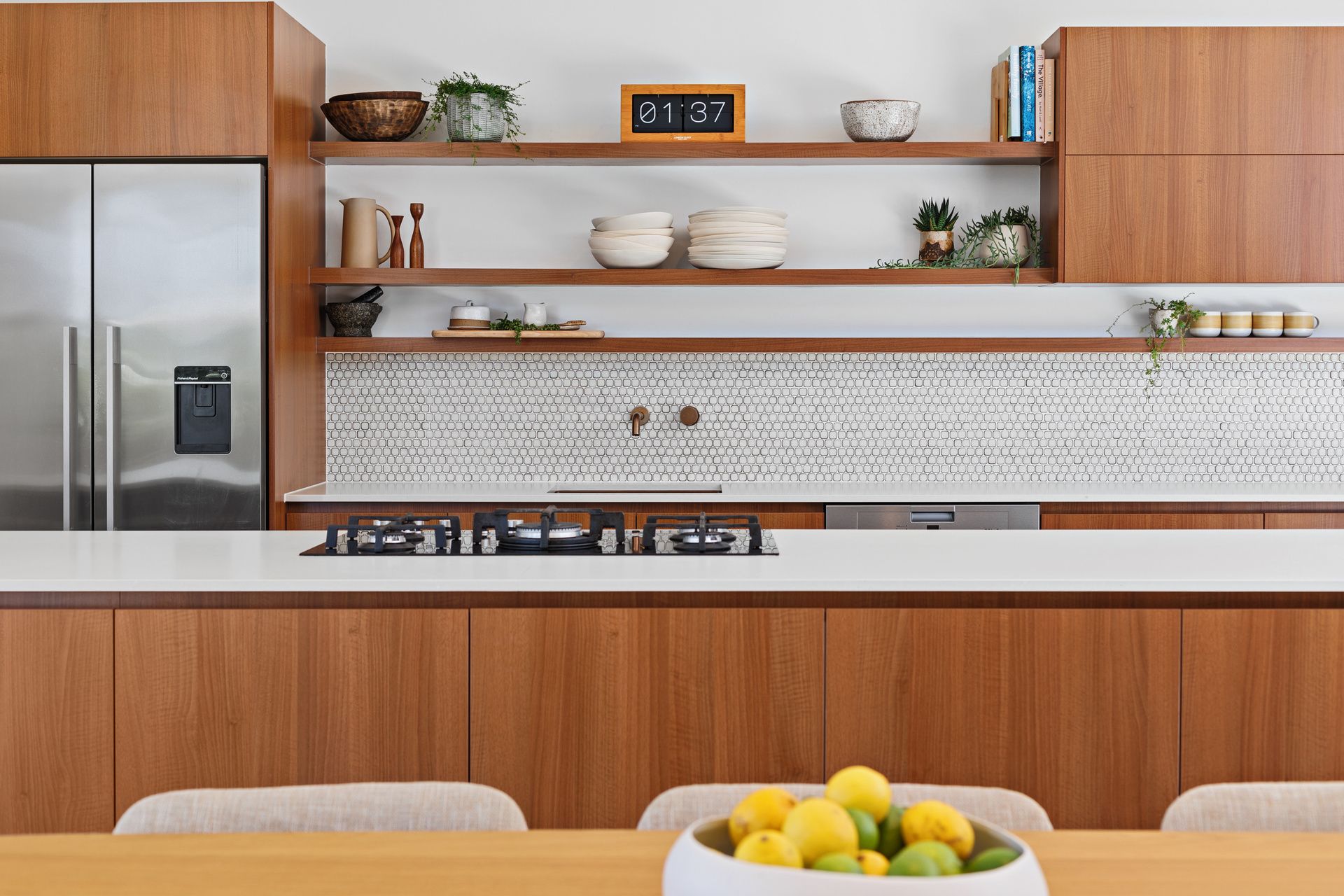 Modern Kitchen: Featuring stone countertops, a Miele integrated dishwasher, copper tapware, a 900 gas cooktop, and custom-built cabinetry.