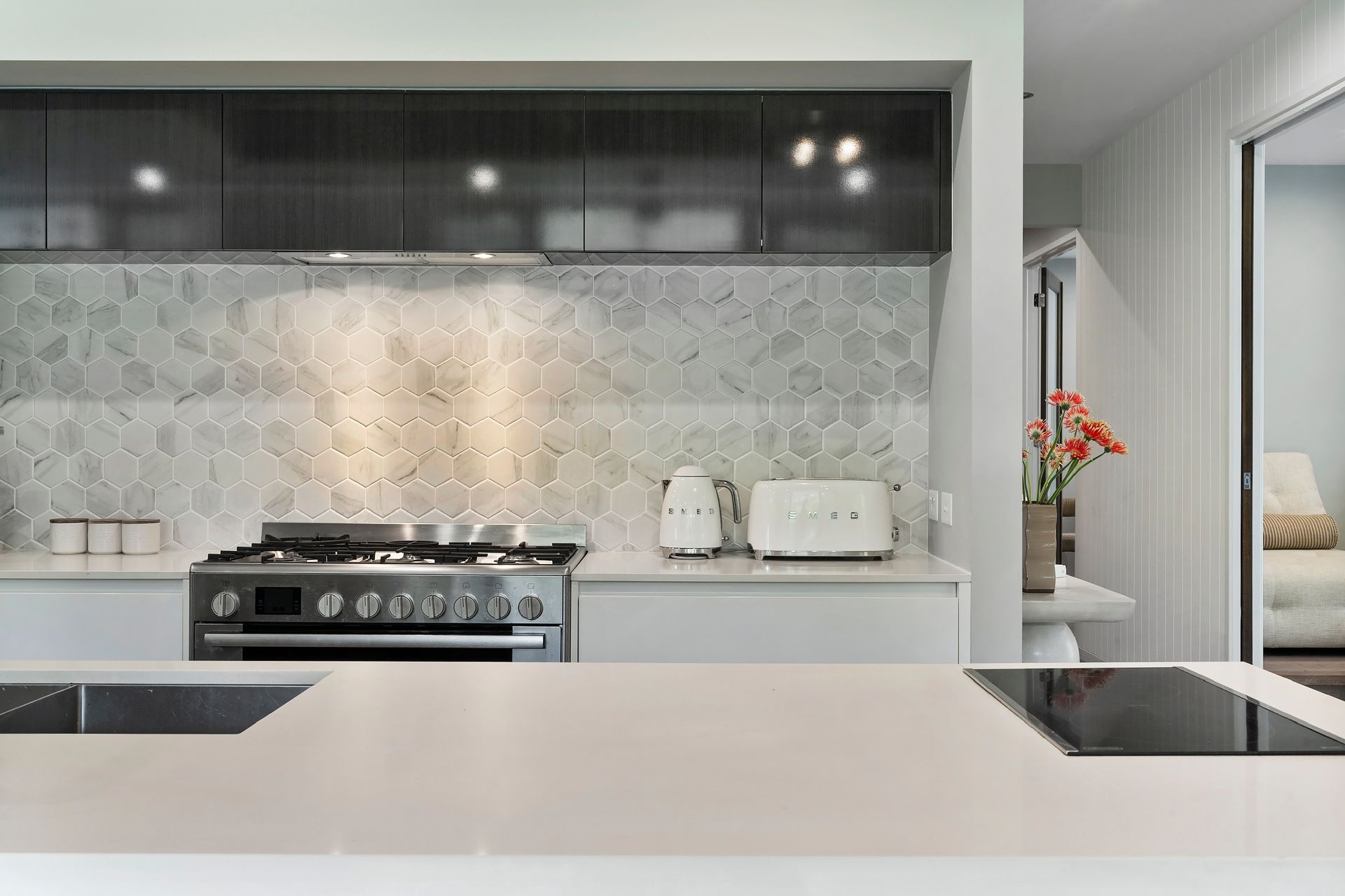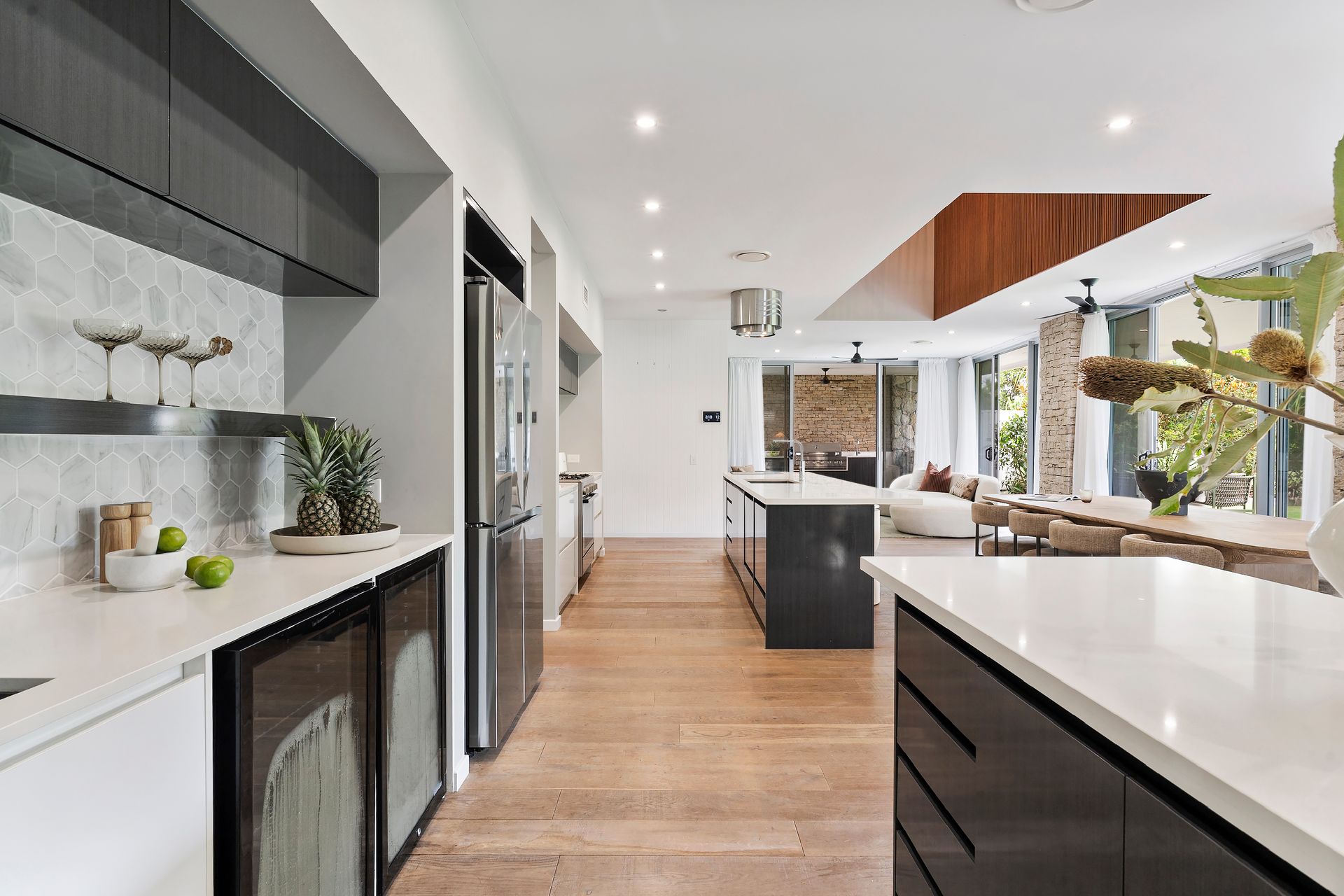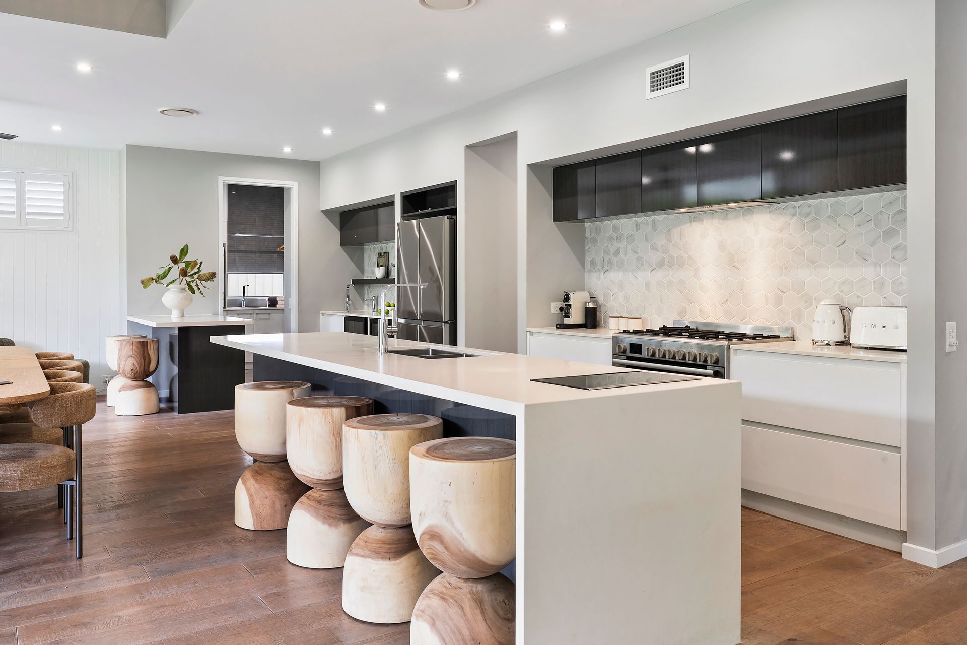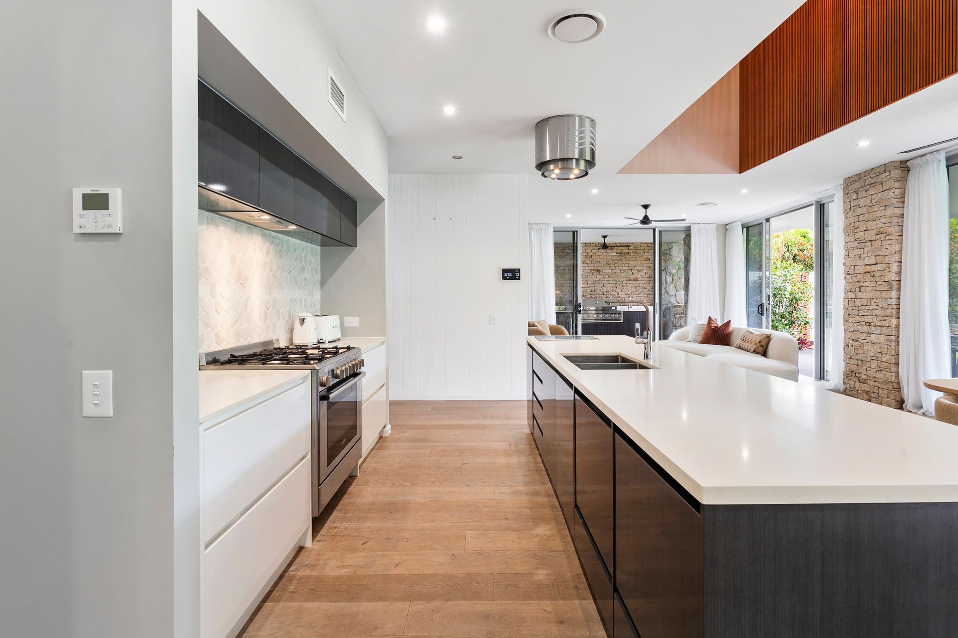 Gourmet kitchen features high‑end finishes: 900 mm gas cooktop, induction cooking zone, a sleek Caesarstone island, custom cabinetry, and a butler’s pantry for added convenience.