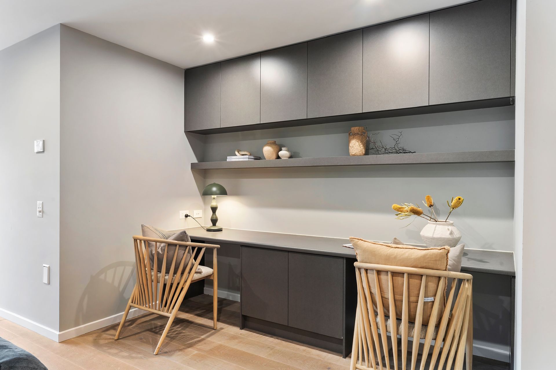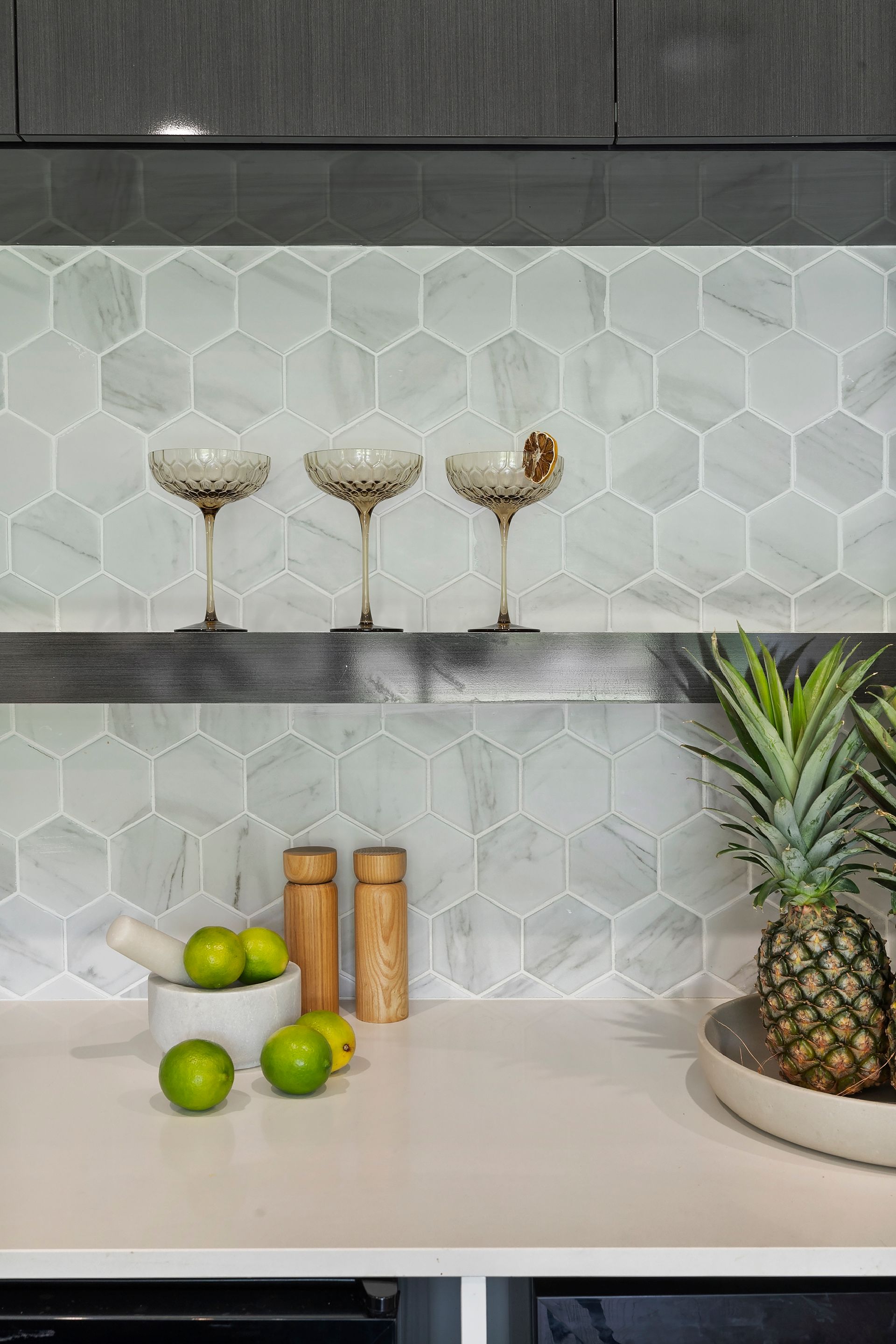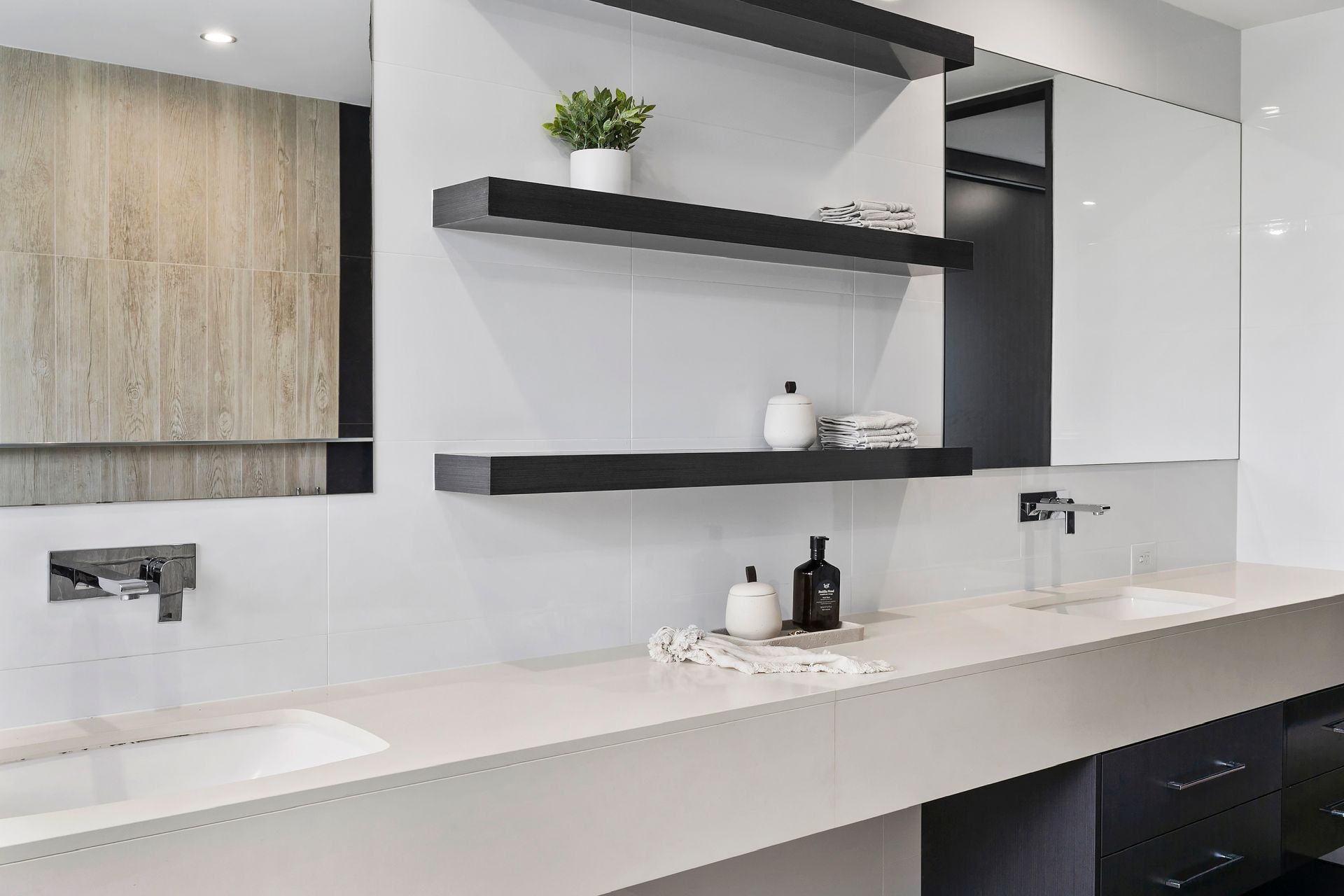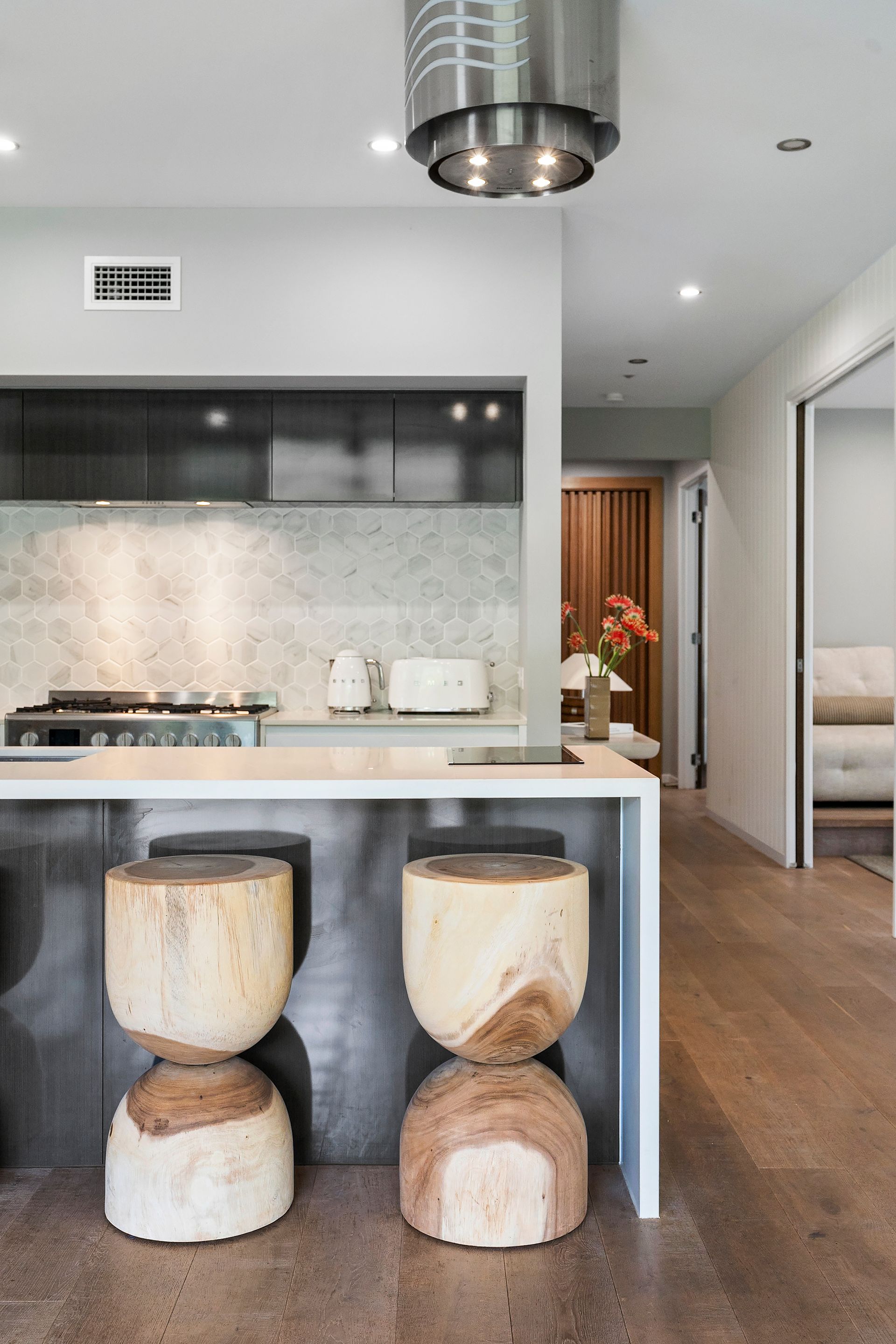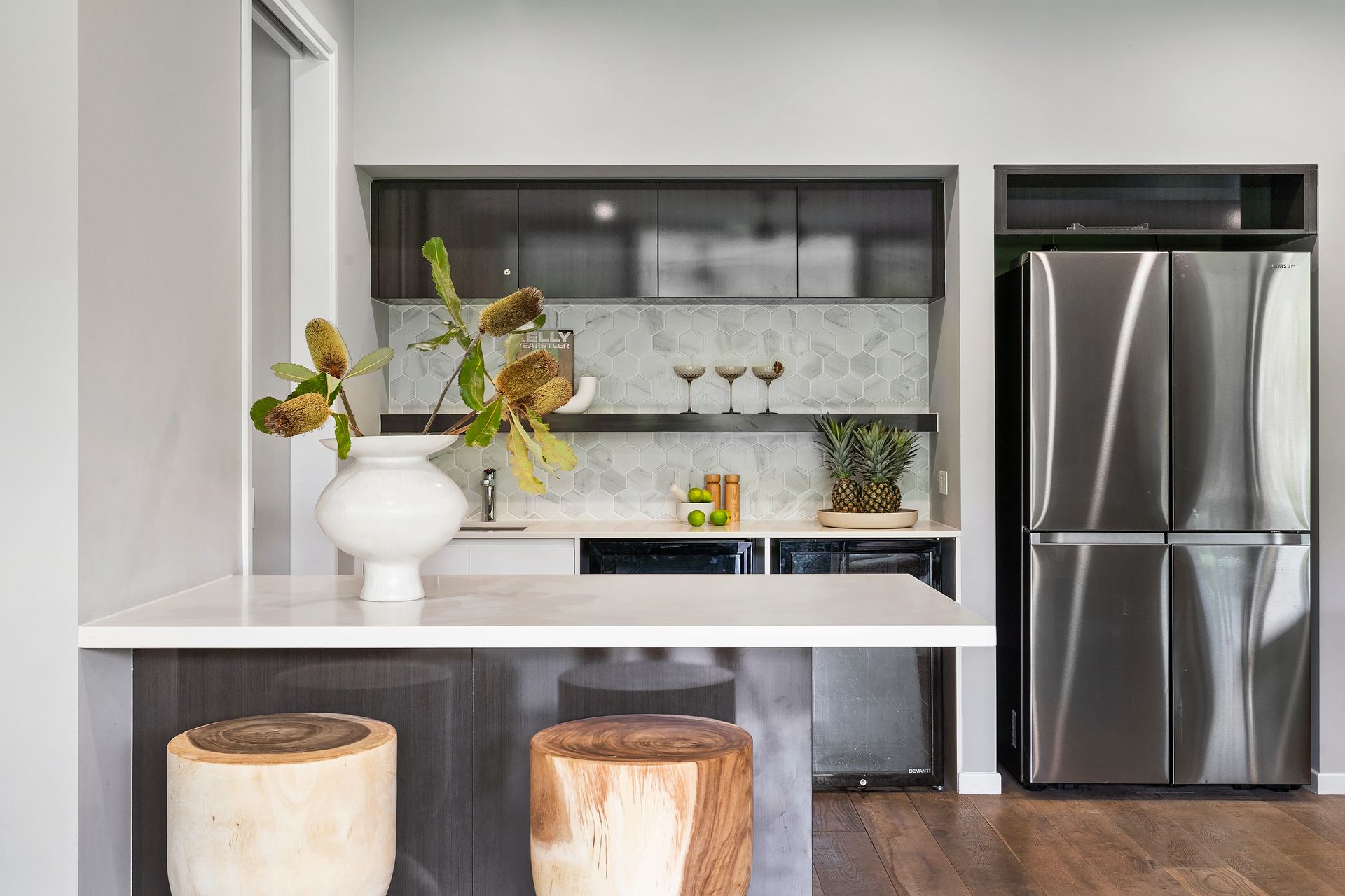 Gourmet kitchen features high‑end finishes: 900 mm gas cooktop, induction cooking zone, a sleek Caesarstone island, custom cabinetry, and a butler’s pantry for added convenience.