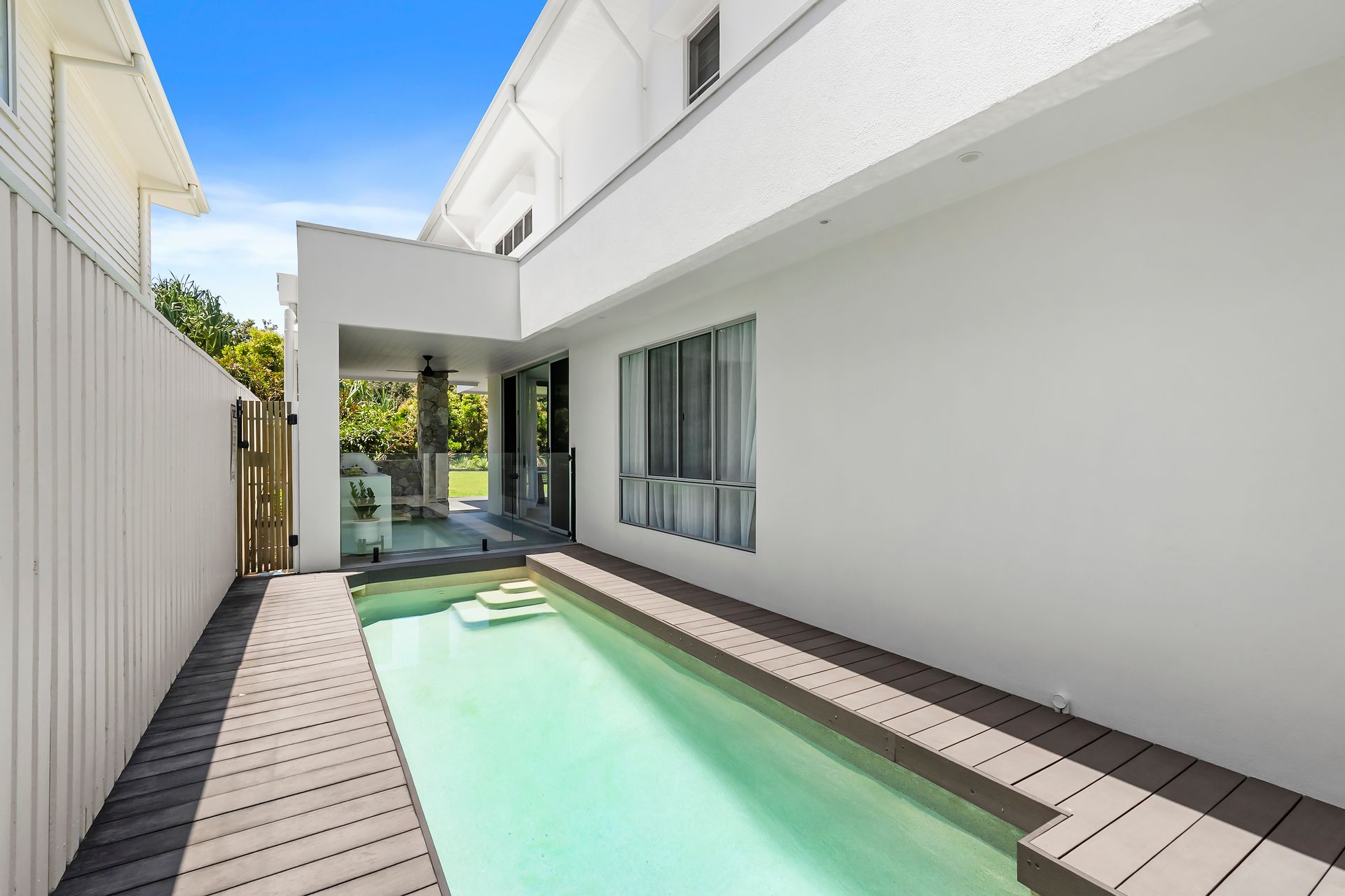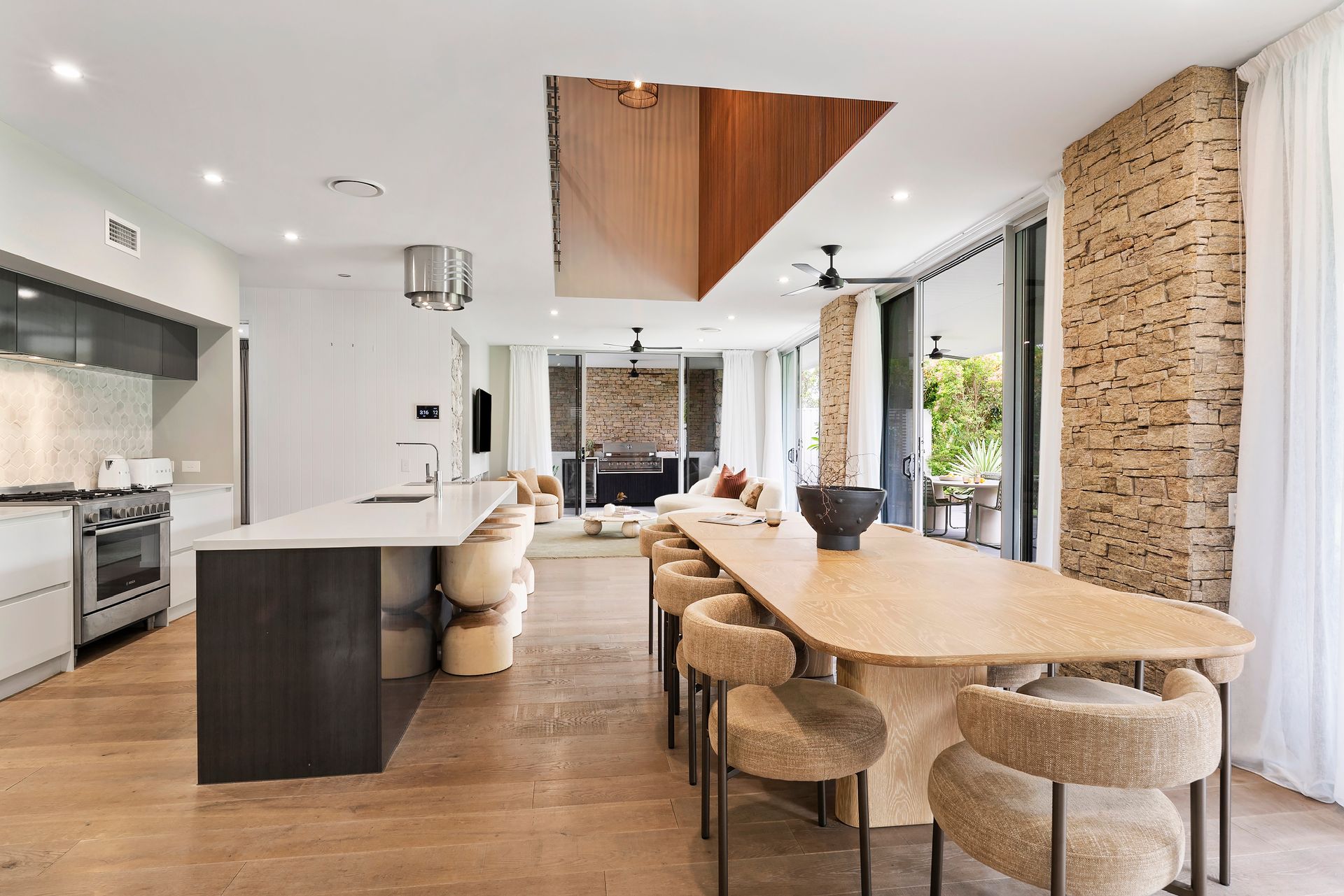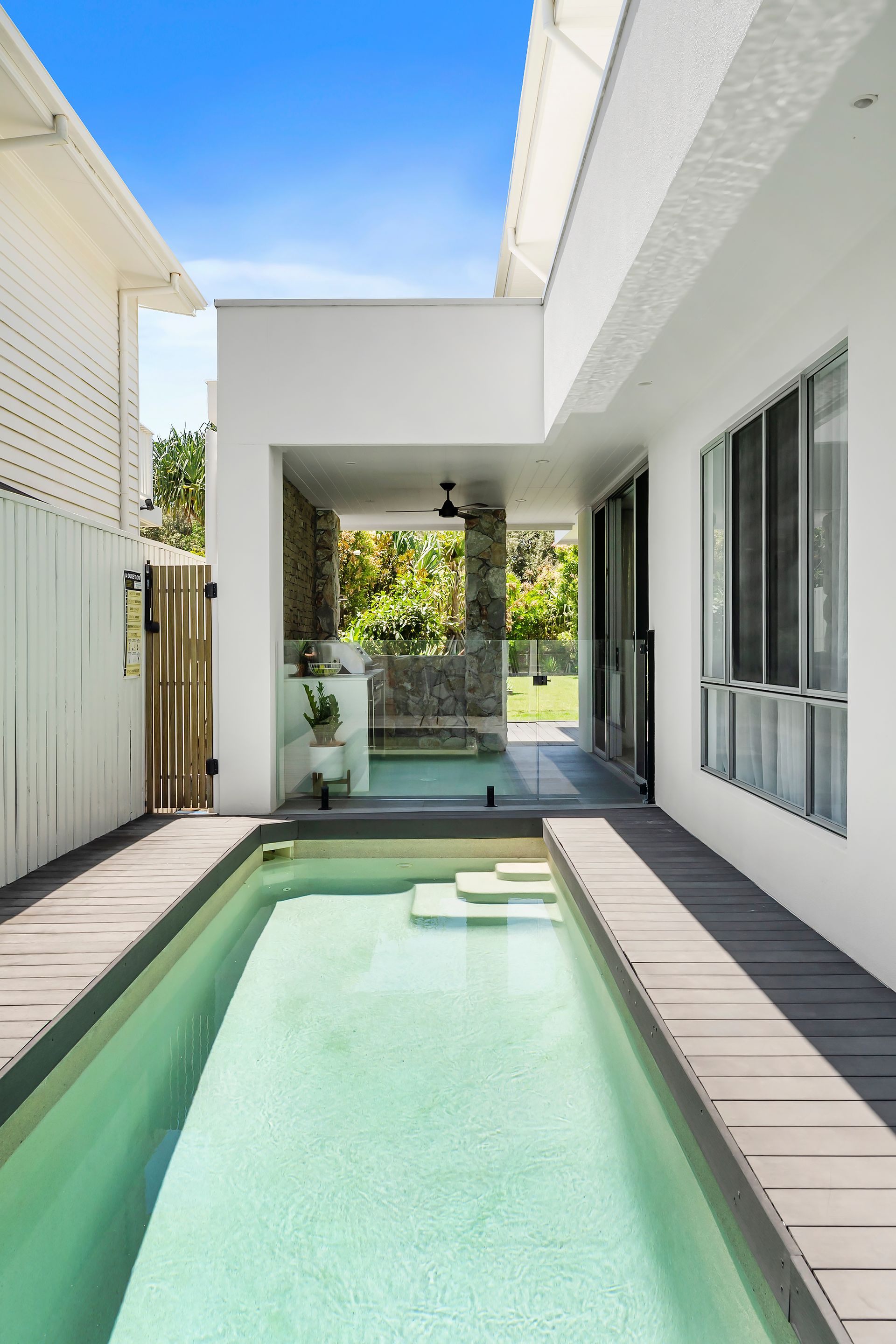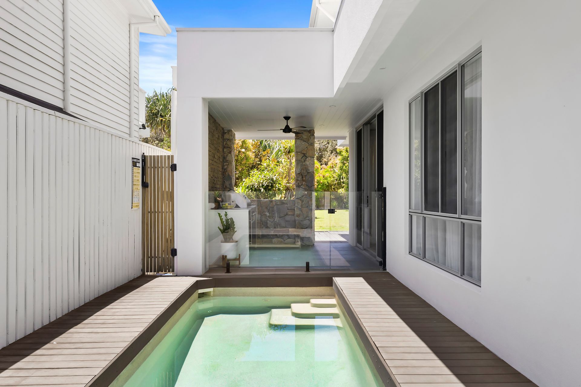 Seamless indoor–outdoor living flows through expansive sliding glass doors, connecting living areas to the alfresco deck and saltwater pool.