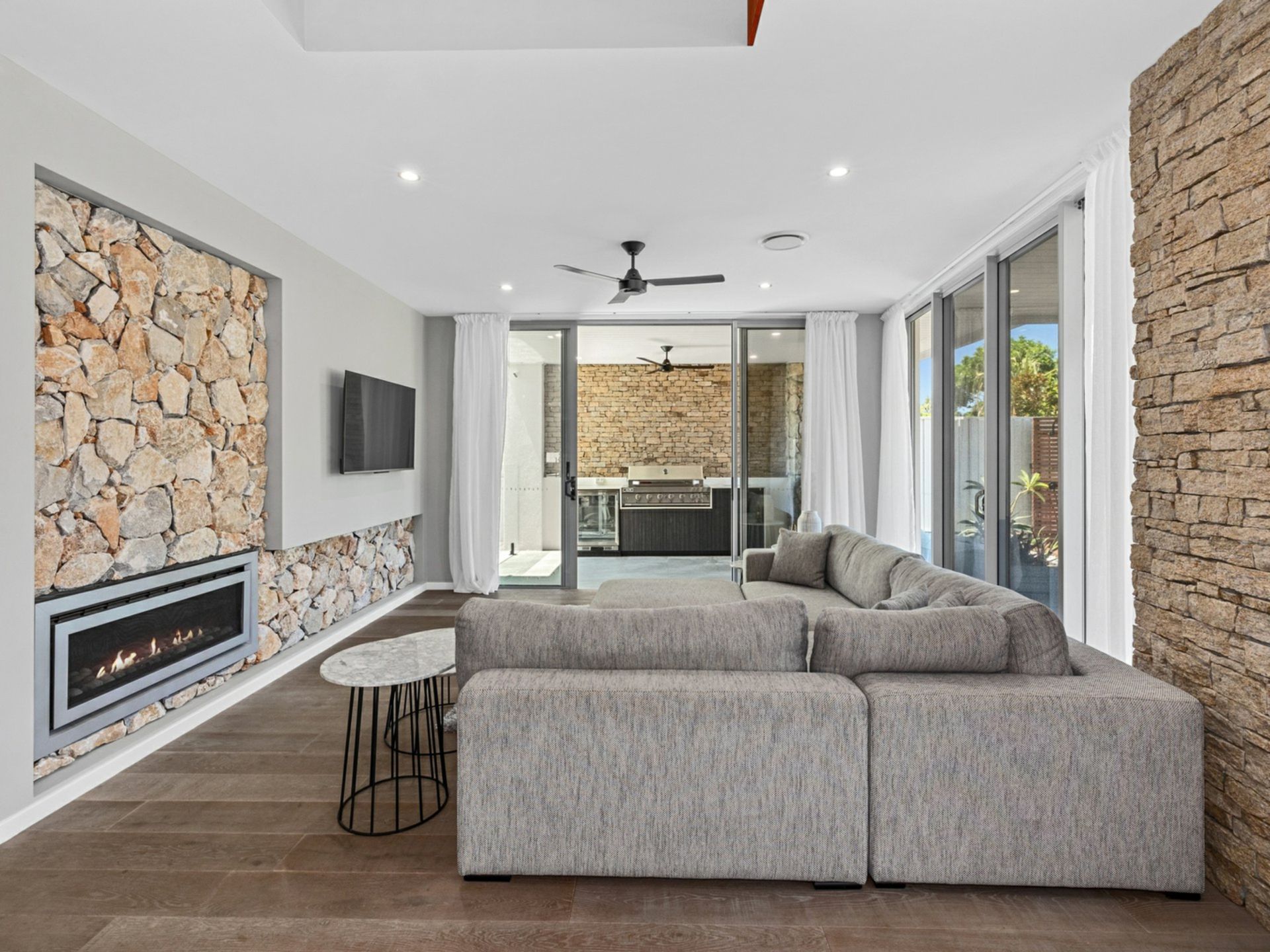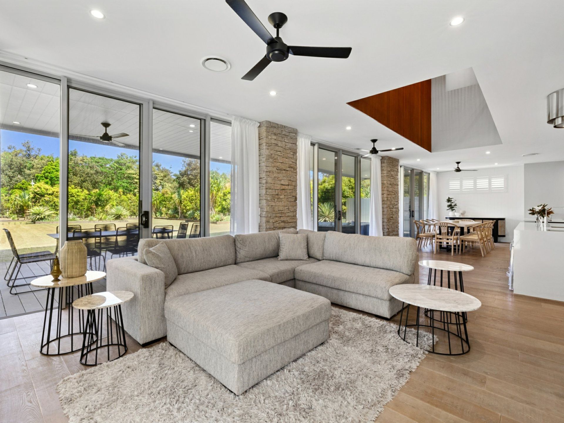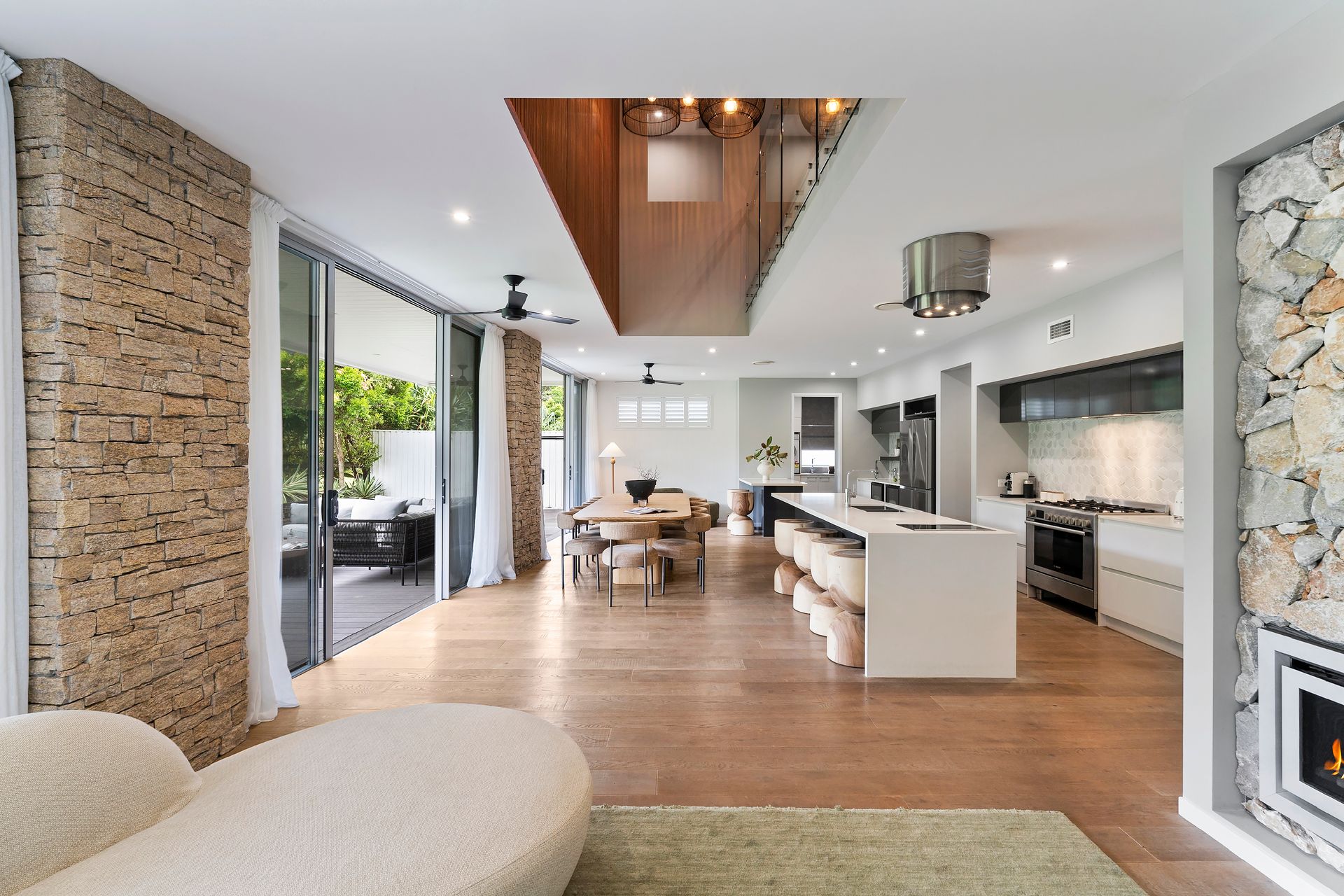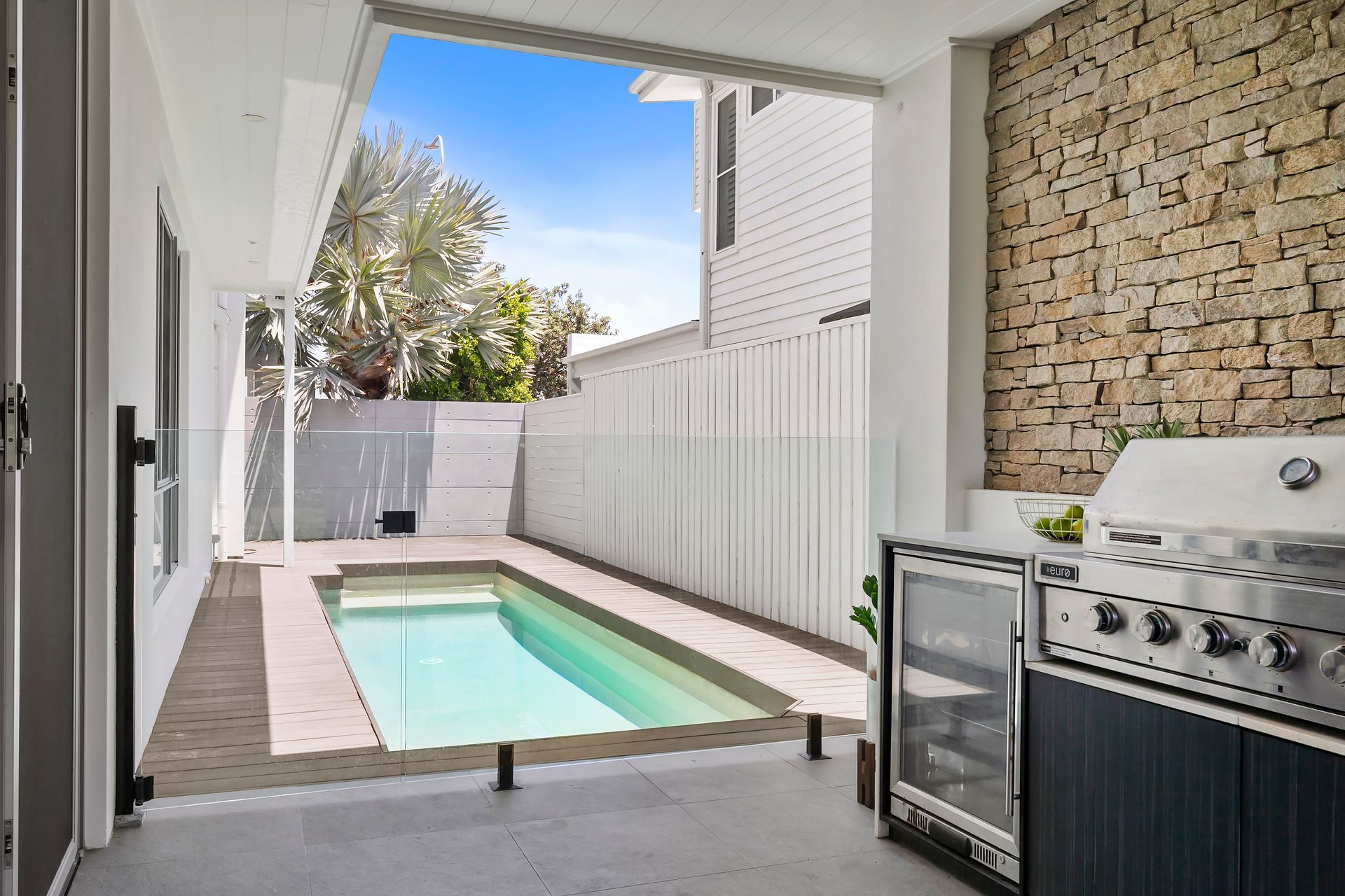 Seamless indoor–outdoor living flows through expansive sliding glass doors, connecting living areas to the alfresco deck and saltwater pool.