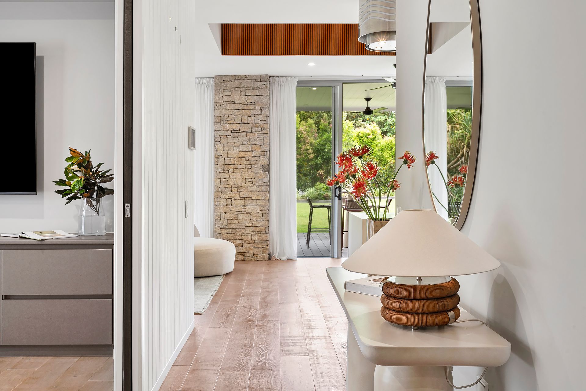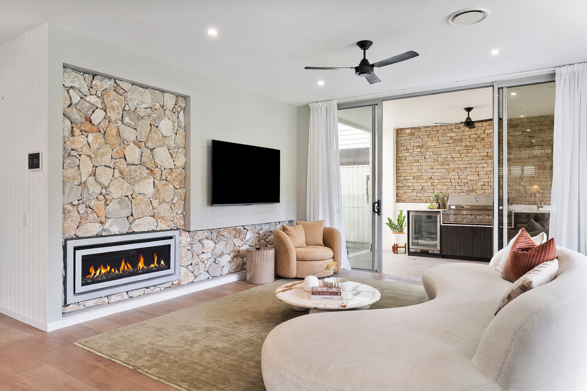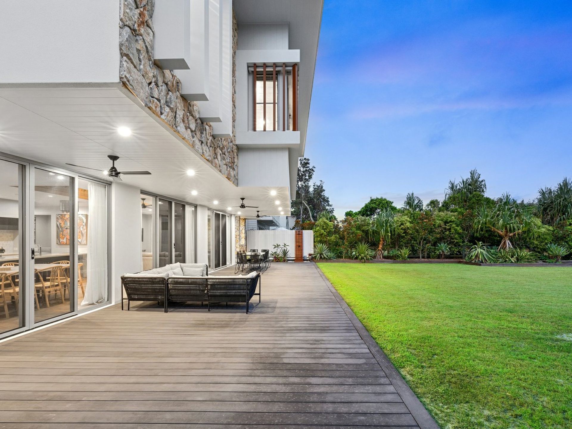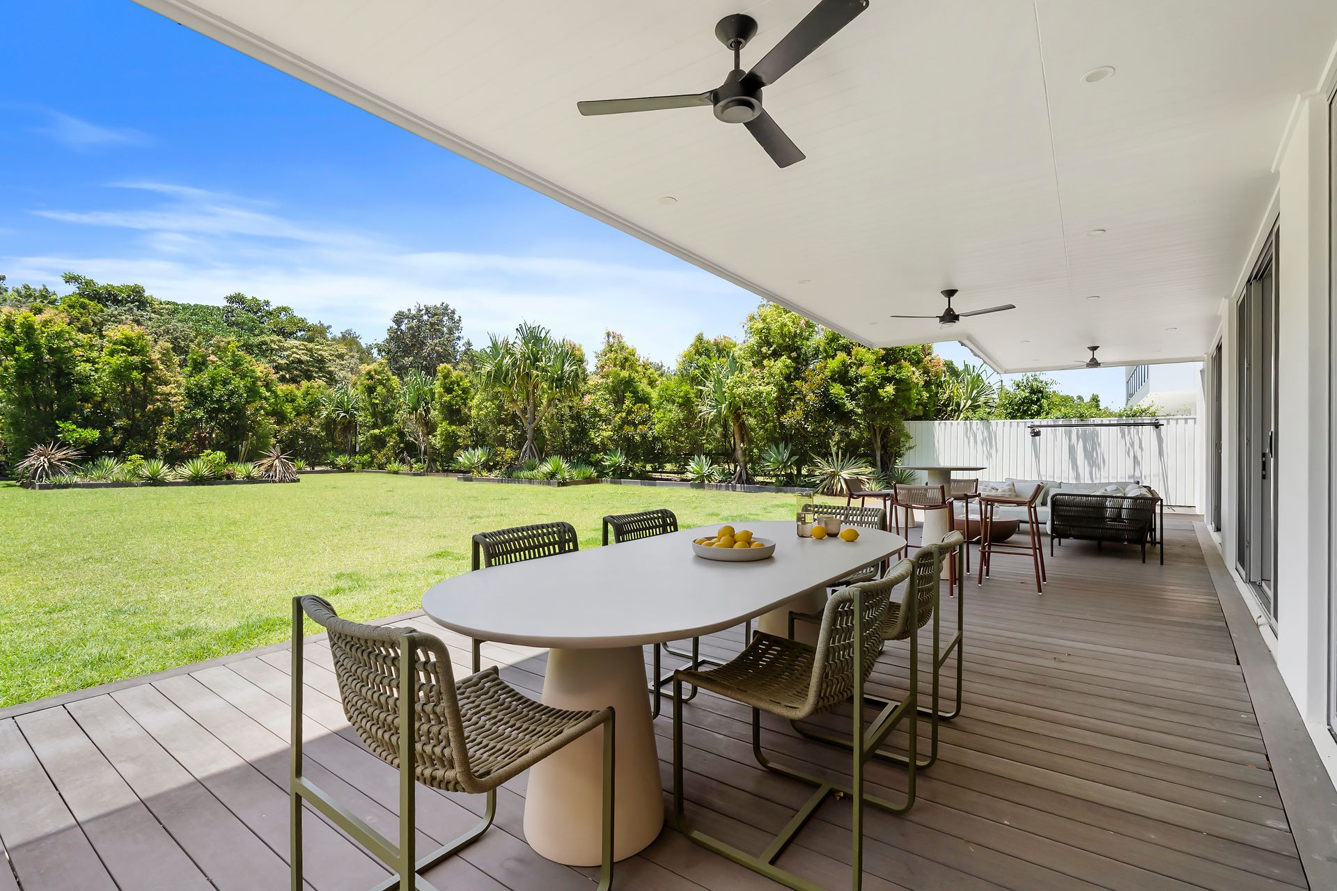 Seamless indoor–outdoor living flows through expansive sliding glass doors, connecting living areas to the alfresco deck and saltwater pool.