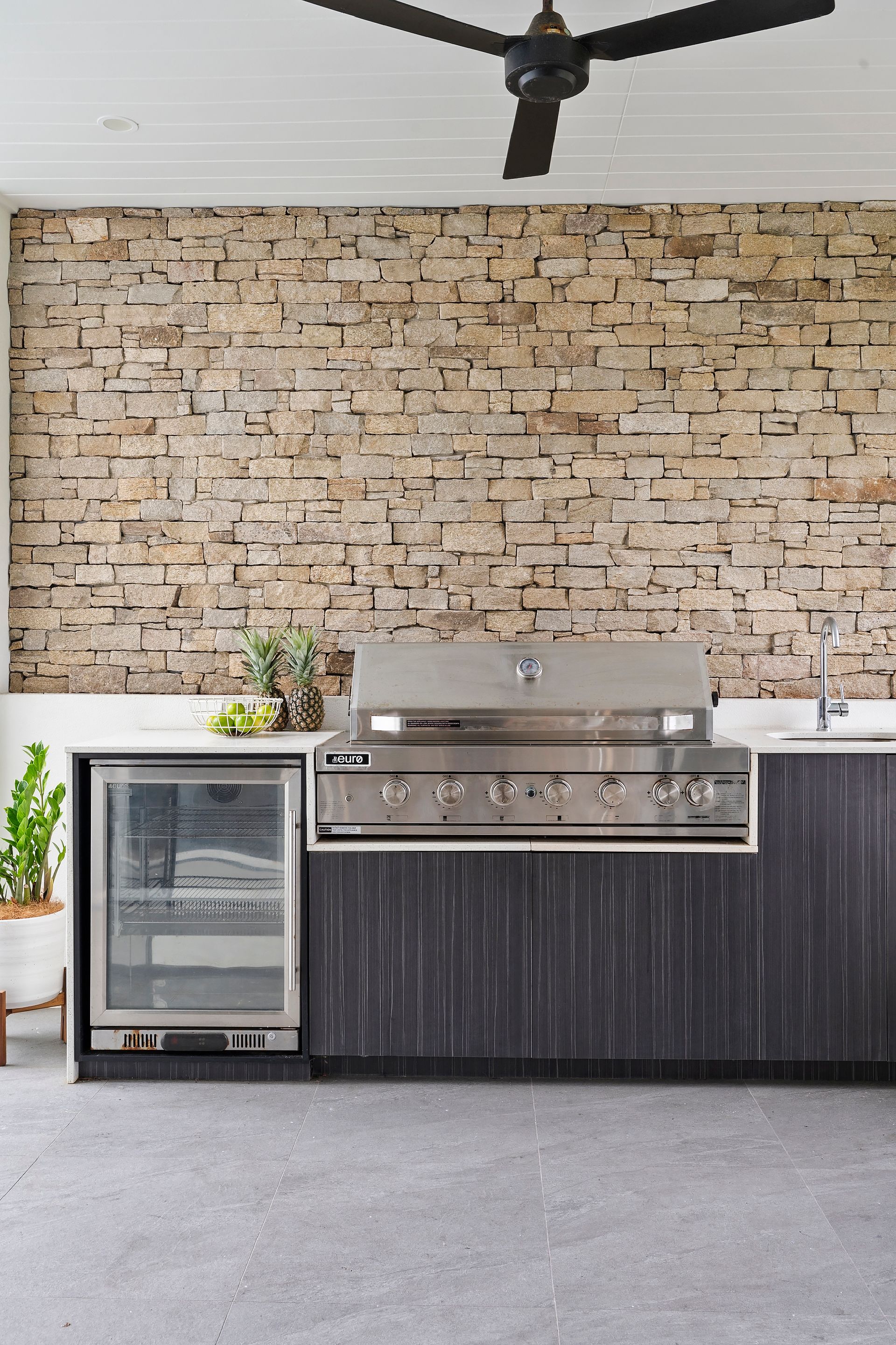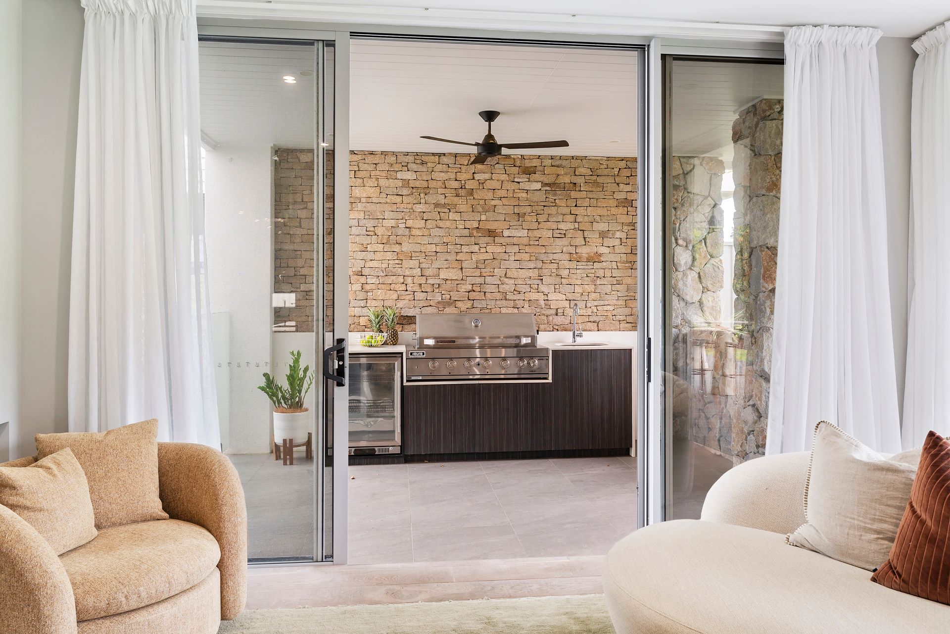 Outdoor kitchen, equipped with a built‑in BBQ and wine fridge, ideal for relaxed beach‑side entertaining.