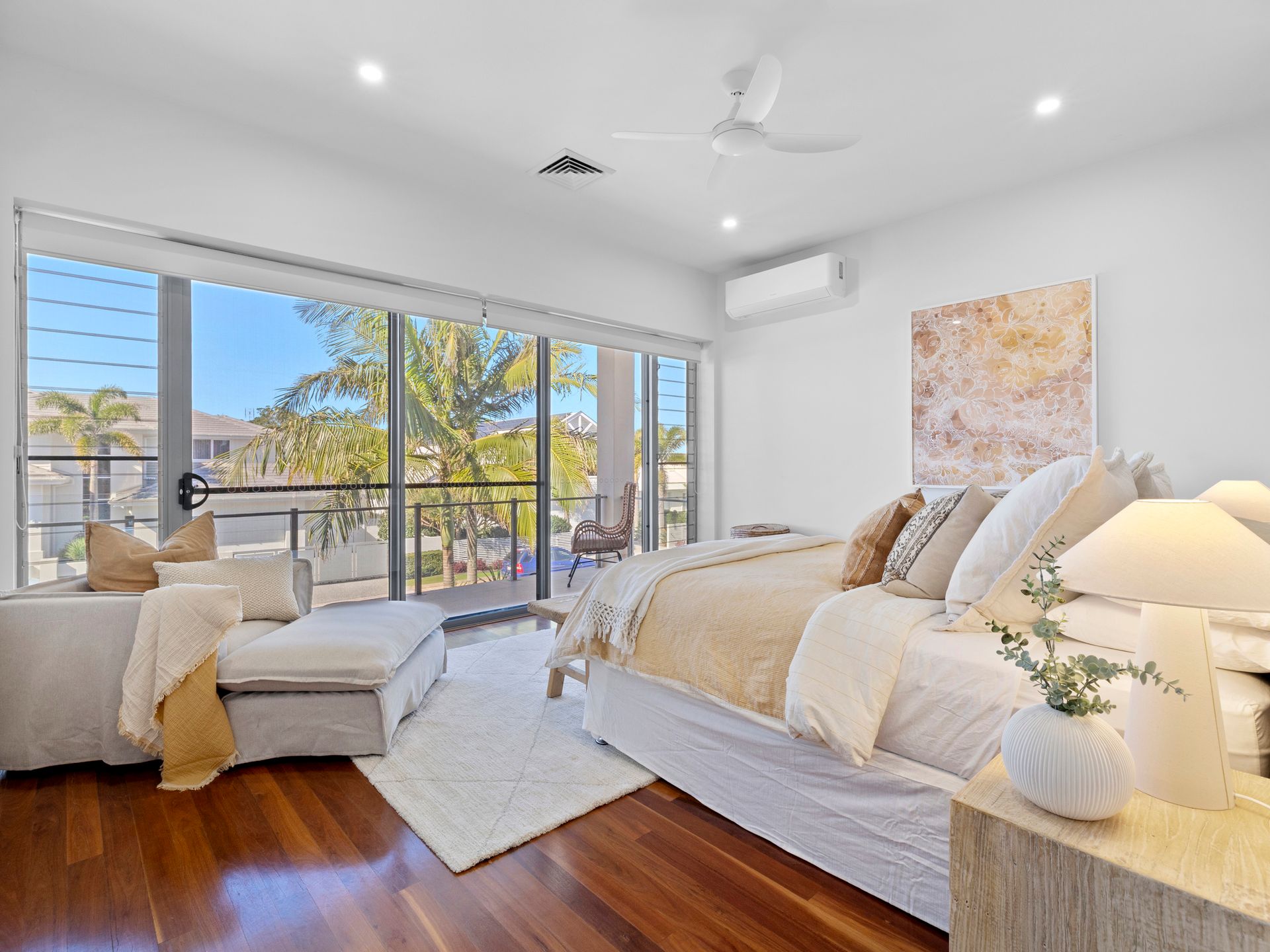 Master Suite: King bed, walk-through robe, deluxe ensuite, and private balcony with beach views