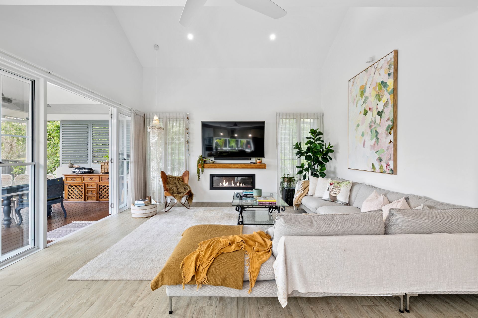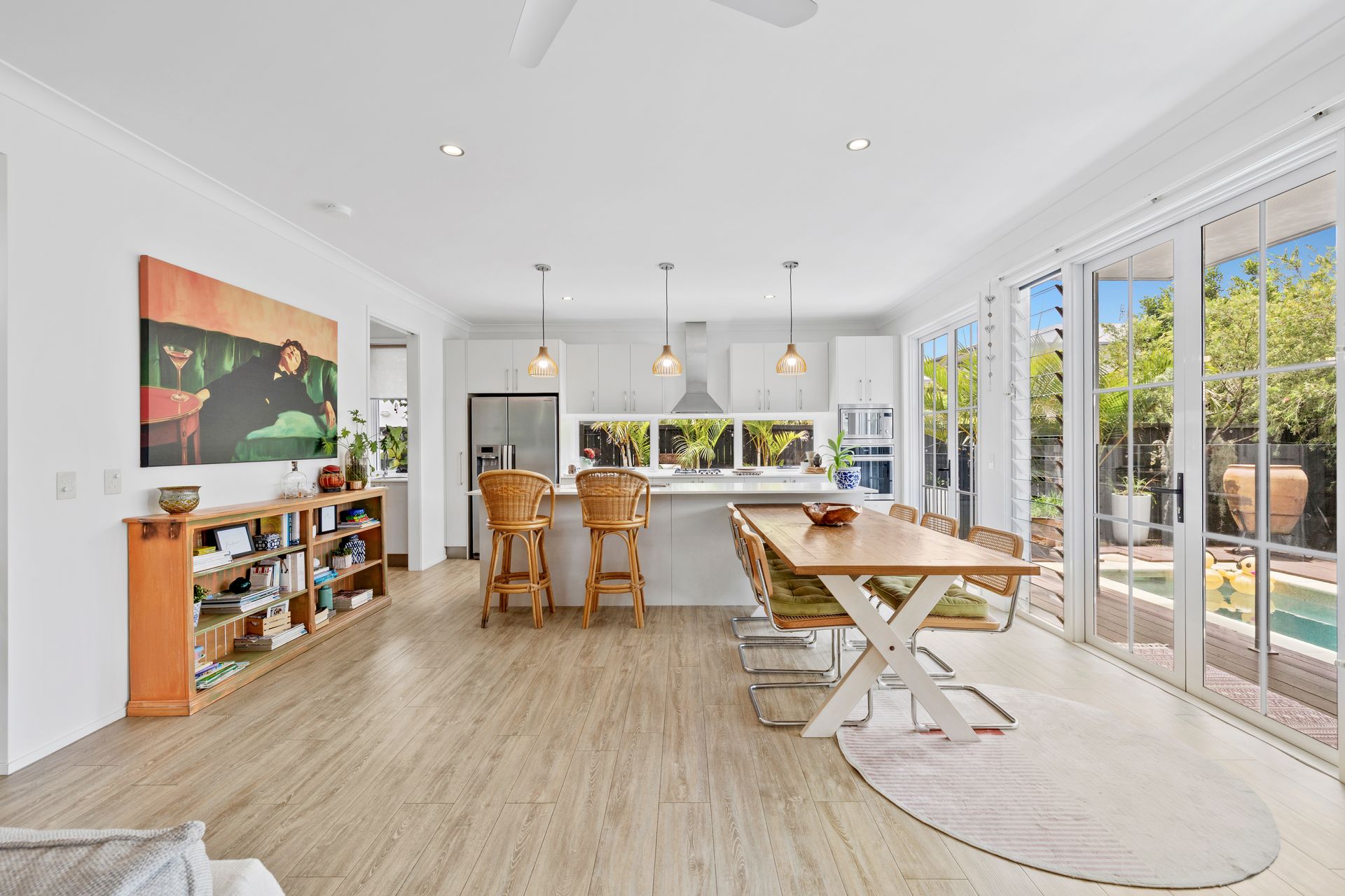 Inside, the open-plan living and dining areas are filled with natural light, flowing
