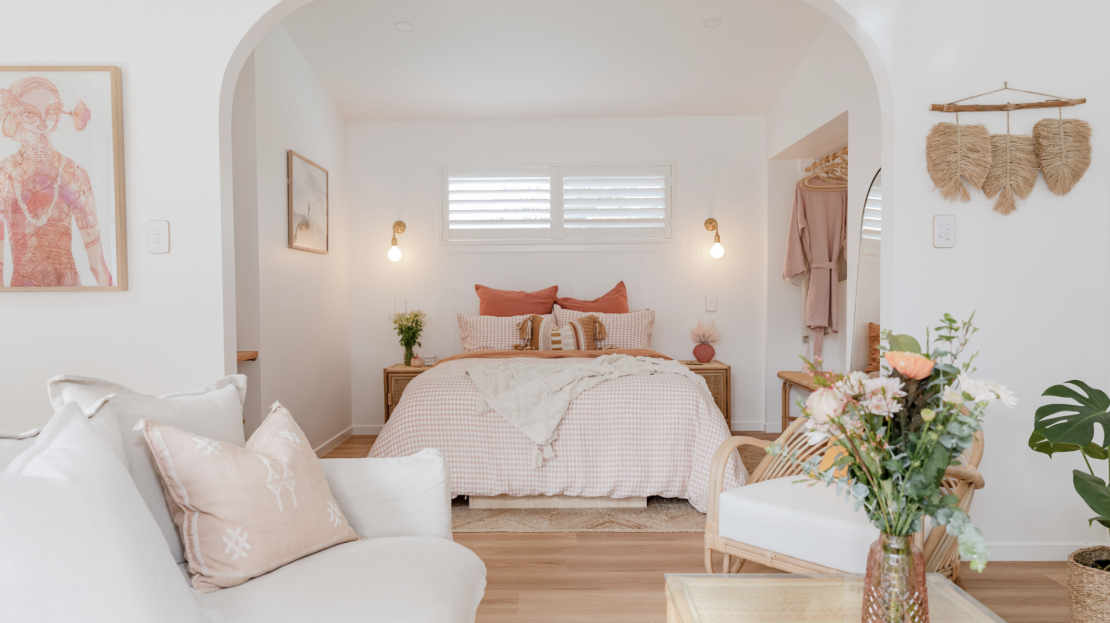 Inside, the open-plan lounge boasts a comfy cloud sofa, bohemian rattan furniture, a vintage Moroccan rug, and a smart TV that rotates to face the bed for cosy movie nights. The bedroom features a queen bed, brass bedside lighting, USB points, a full-length mirror, and a dedicated makeup area.